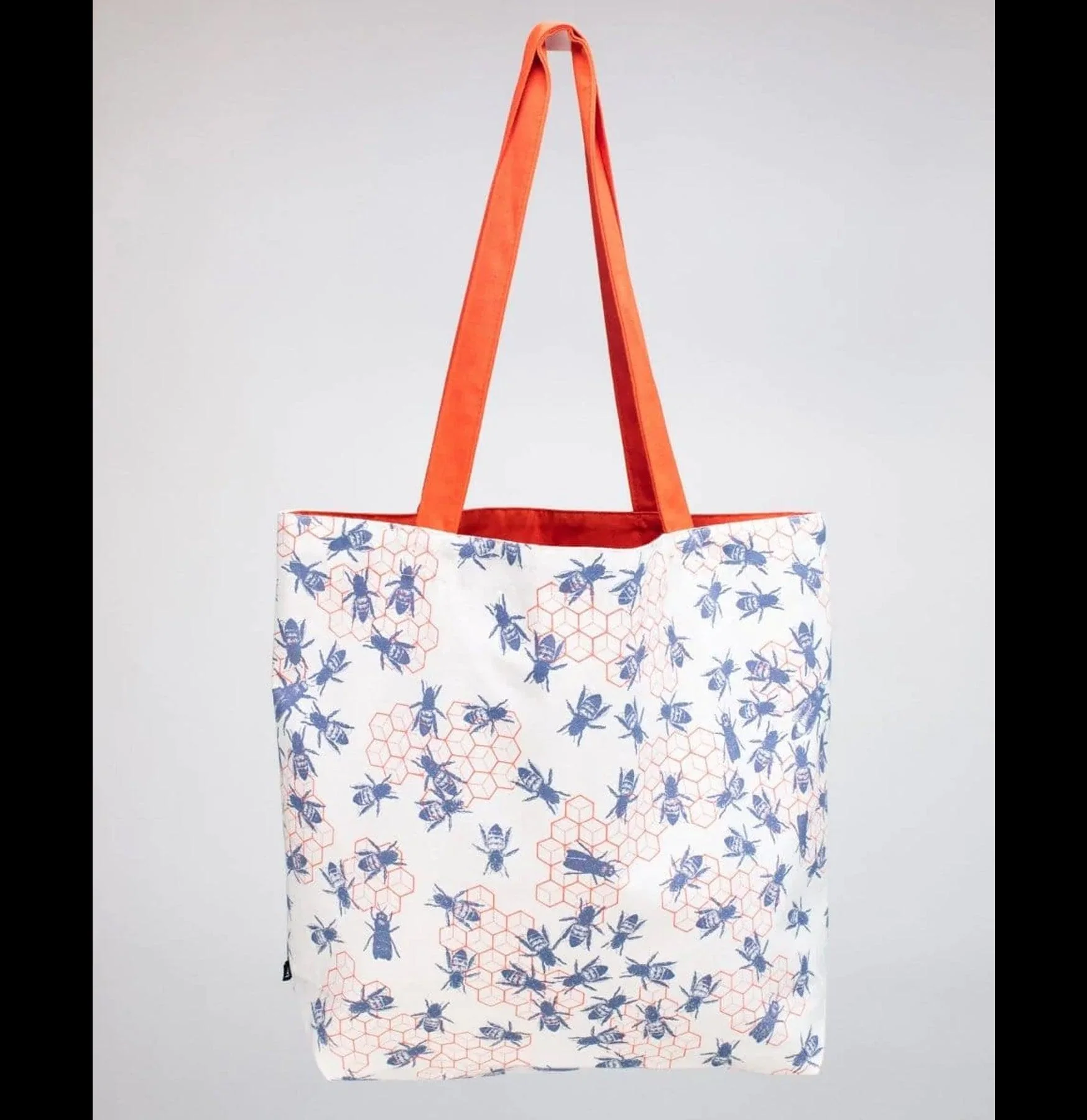 This sturdy canvas tote bag is reversible with solid tangerine orange and a zipper pocket on one side, or you can flip it around and wear it with the honey bee design on the outside for all the world to see.