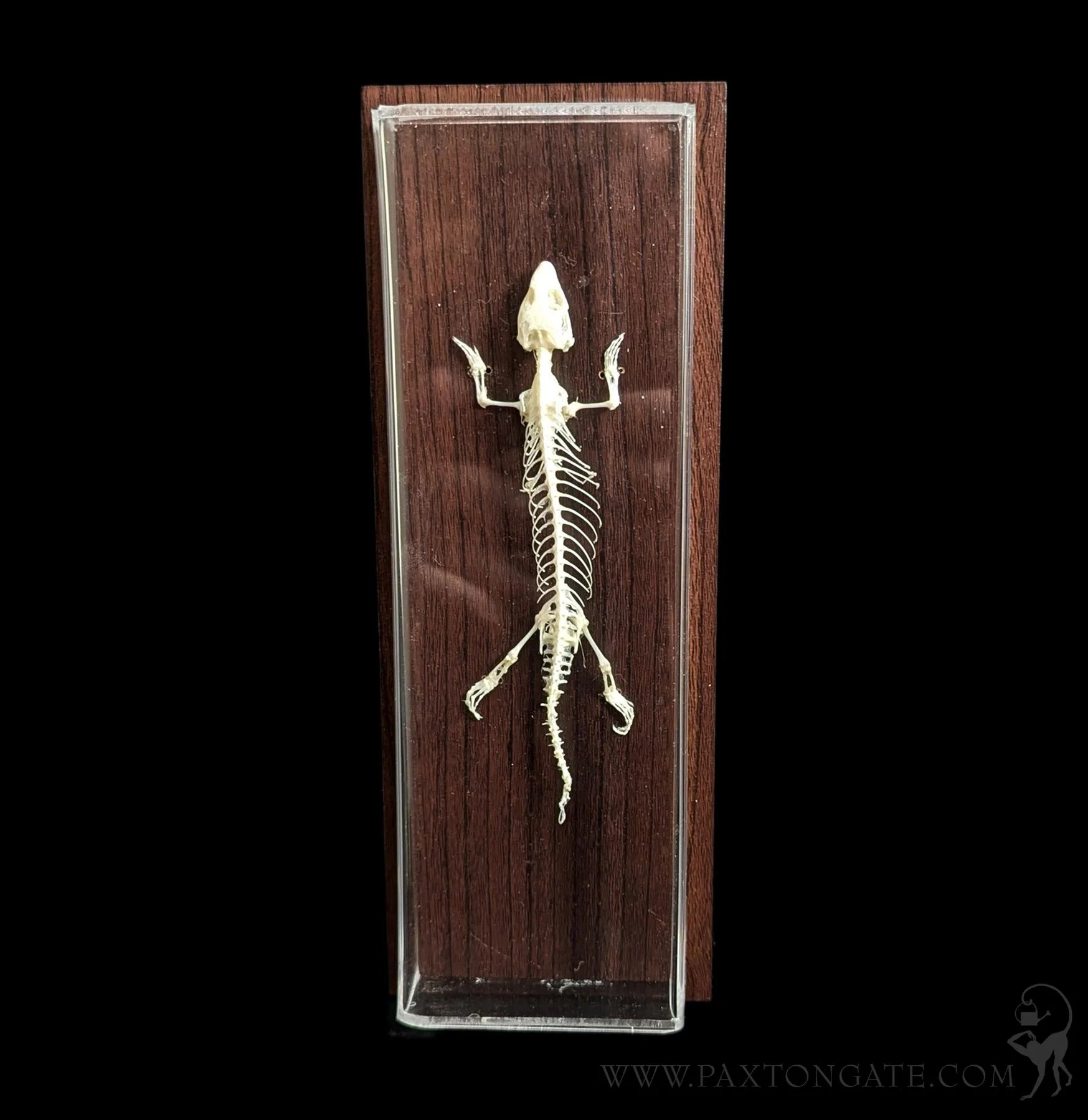 This articulated Eumences chinesis skeleton is securely mounted on a wooden base and safeguarded beneath a removable plexiglass case.