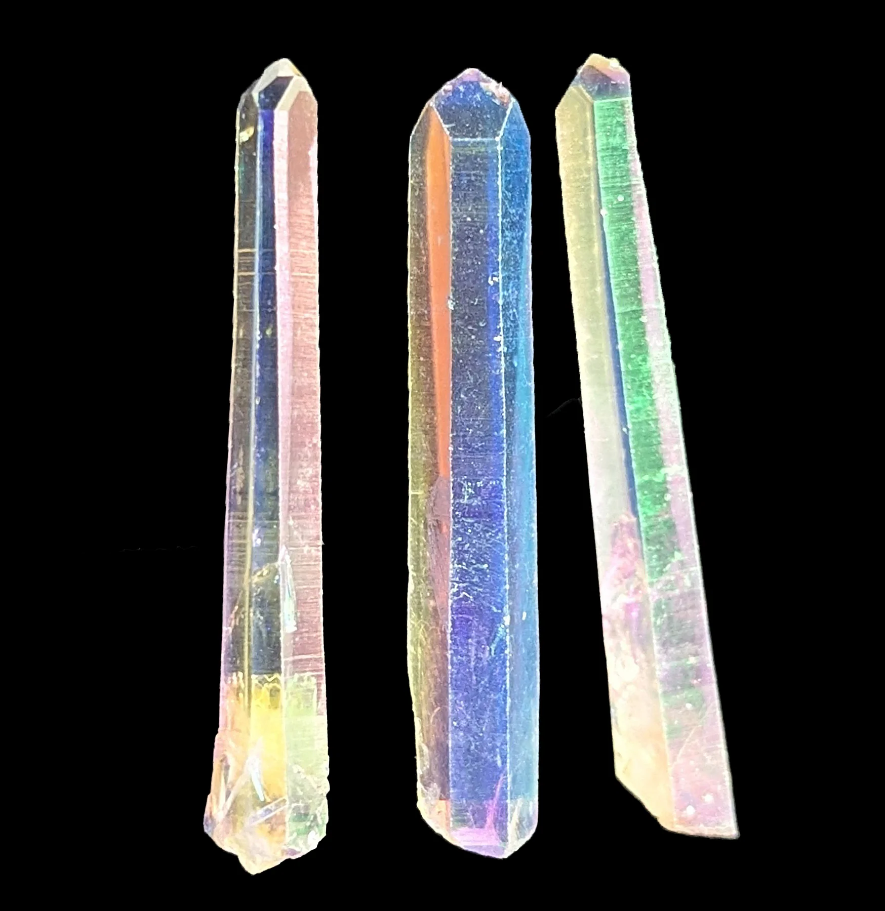 Also known as angel quartz, opal aura quartz is distinct from regular quartz due to its partially synthetic nature. It gains its iridescent hues through a bonding process with platinum and, sometimes, silver. To create this effect, a clear quartz crystal is heated to high temperatures and exposed to platinum and silver vapor. The metals then bond at the atomic level with the quartz's silicon dioxide, resulting in a stunning, iridescent rainbow glow that will surely catch the eye in any collection.