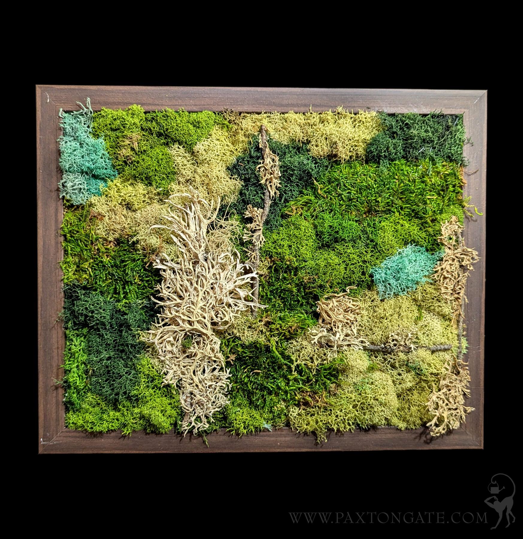 Each moss wall is made from a variety of 100% preserved moss, arranged inside of a thrifted piece of framed art. No care is needed for these pieces, which makes them ideal for a pop of greenery in an otherwise uninhabitable spot! In fact, these moss walls prefer lower light; direct light can lead to sun bleaching of certain mosses in the piece. From the artist’s perspective, these pieces represent the natural world’s eventual domination of civilization, growing over and sprawling across what was once a society built from concrete and brick (or in this case, corporate art). These moss walls are completely maintenance free and can be enjoyed for years to come!