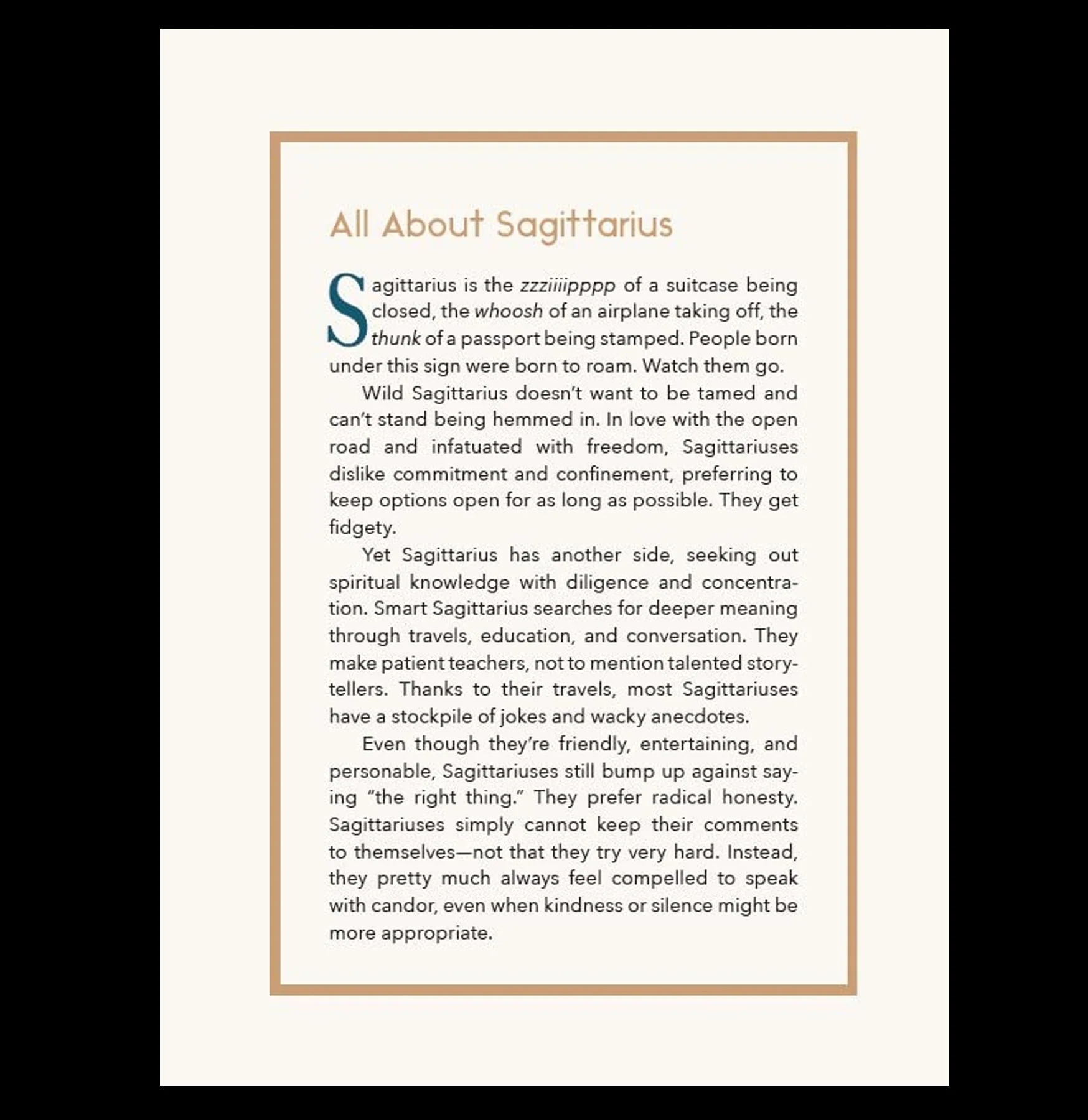 - Fun bonus material includes a sun sign yearbook page, a zodiac compatibility matrix, lists of famous duos and their zodiac signs, and career ideas for each sign.