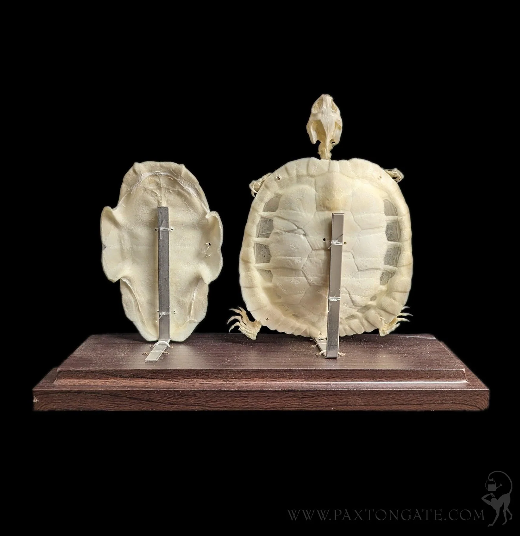 The earliest known turtle remains date from 220 million years ago, making them one of the oldest reptile groups. Their shell has evolved to contain around 60 bones which include portions of the ribs and backbone. That means a turtle can't ever escape its shell. The complex structure is articulated beautifully in this specimen and you can be sure it won't be able to escape your collection either. These are real bones and Mother Nature will provide slight variances from one to the next.
