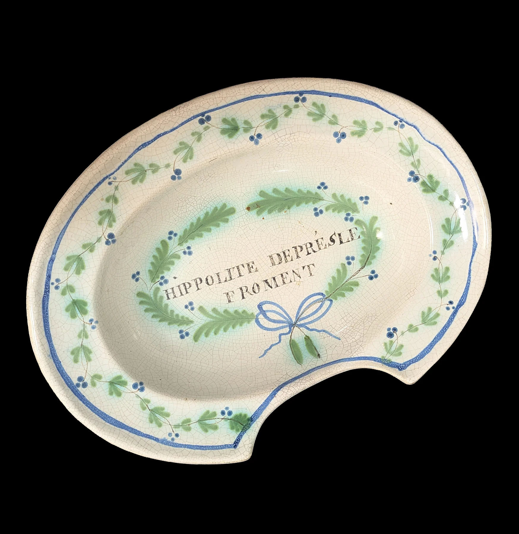 The wording on the bottom, Hippolite Depresle Froment, is actually a French name. It does not translate as a phrase, but its roots roughly mean “one who frees horses.” What that has to do with bleeding into a bowl is anyone’s guess, but it certainly adds another layer of intrigue to this curio.